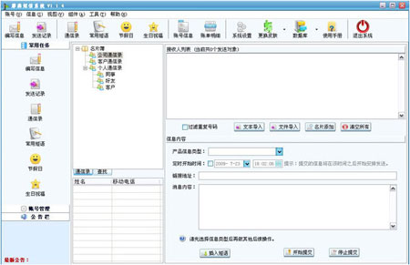 最新版軟件采用最前沿的界面風(fēng)格,軟件運行速度更快,效率更高,支持對大數據量的高效處理,新增發(fā)送狀態(tài)返回、軟件在線(xiàn)升級、短信互動(dòng)、全網(wǎng)接收回復短信、自定義個(gè)性投放模式、等強勢功能,系統管理界面: